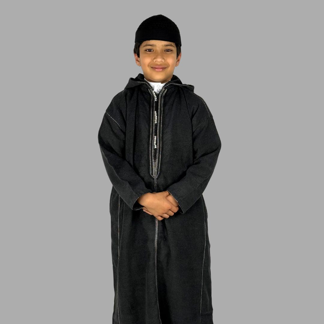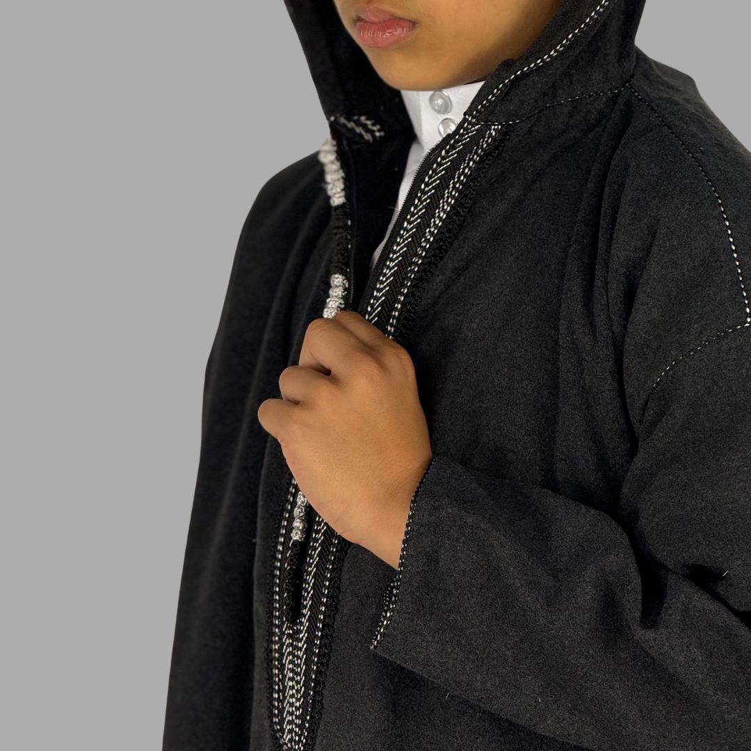 Boys Premium Ash Black Hooded Moroccan Thobe
